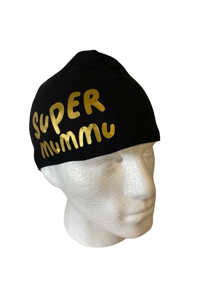Super Mummu2, kultaisella painatuksella. Trikoopipo, lyhyt malli