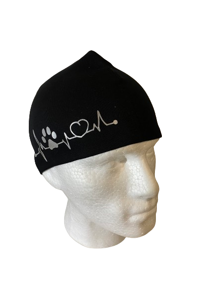 Sydänkäyrä tassu, heijastavalla painatuksella. Trikoopipo, lyhyt malli